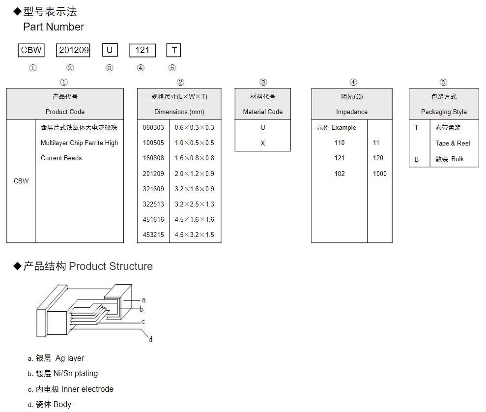 風華高科疊層片式鐵氧體大電流磁珠(CBW)命名規則: