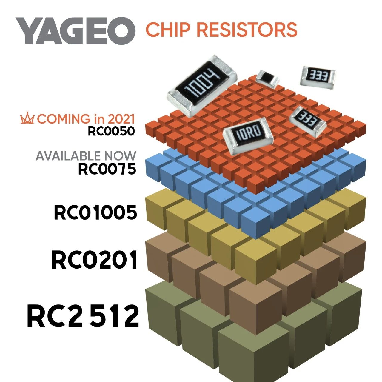 目前RC系列厚膜晶片電阻提供完整的尺寸- 從0075, 01005, 0201到 2512,完全滿足客戶各種不同的應用需求,達到高效能和多功能的目的。為迎接5G新科技時代的來臨,國巨擴大資本支出投入RC0075晶片電阻,除了是在高階通訊電子市場的超前布署外,也預告將于2021年領先業界完成開發下一代尺寸的晶片電阻RC0050 (M0201),持續展現國巨堅強的研發技術能力。