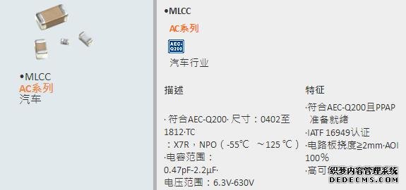 YAGEO國巨推出了具有兩個溫度特性的AC Automotive系列MLCC電容器NPO和X7R。特殊的產品設計,精選的原材料以及專用的批量生產環境使AC Automotive系列具有出色的長期可靠性和改善的機械性能。作為一個離散的部分或作為一個陣列,這個新系列涵蓋了信息娛樂以及舒適和便捷應用中所需的產品。