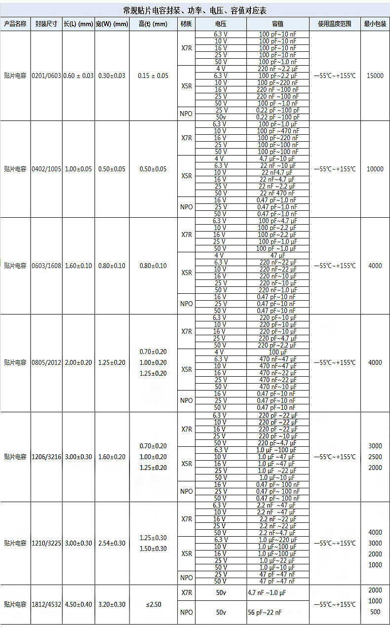 貼片電容封裝,功率,電壓,容值對(duì)應(yīng)表