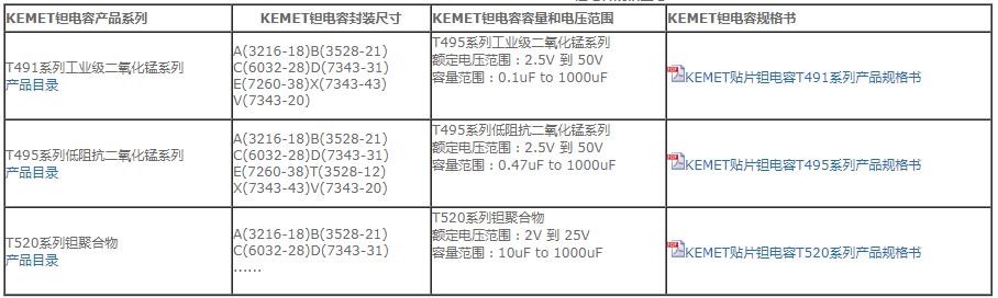 基美(KEMET)是貼片電容和鉭電容的生產商,基美鉭電容的銷售量位居全球第一,基美鉭電容由首字母“T”標明,其后面為一個獨有的系列號,如;T491,T492,主要常用的系列有T491,T492,T494,T495,T496,T510,T520,T530等。每個系列都表示一種共有的物理形式和封裝類型,以及同樣的尺寸范圍和在25℃、50%的相對濕度及一個大氣壓的標準條件下的某些特征。其中T491系列已經增加了物種超薄外殼尺寸,R/2012-12,S/3216-12,T/3528-12,U/6032-15和V/7343-20。