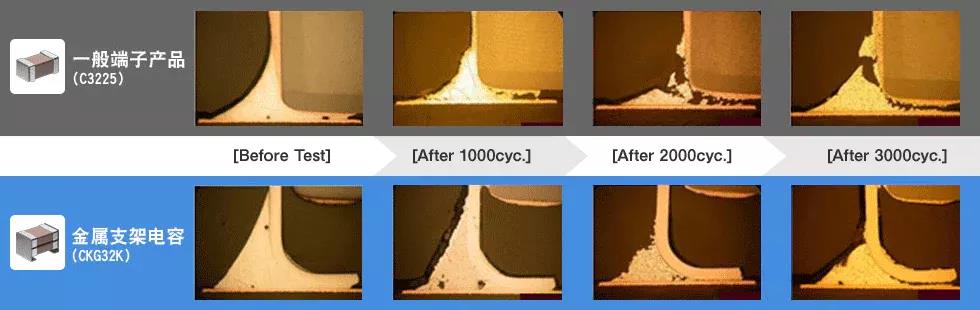 TDK的金屬支架電容對于焊錫裂紋擁有極高的抑制效果。圖5為3000次循環(huán)熱沖擊的截面比較圖,從圖中可以看出,一般端子產(chǎn)品相比金屬支架電容,其焊錫更易劣化。特別在2000次循環(huán)以上,其差異更加明顯。