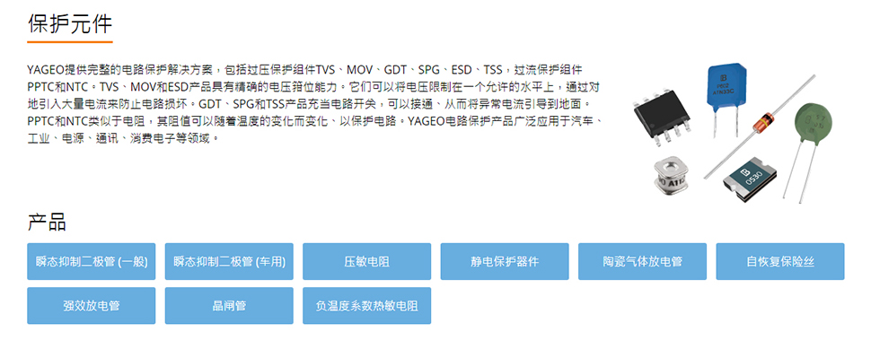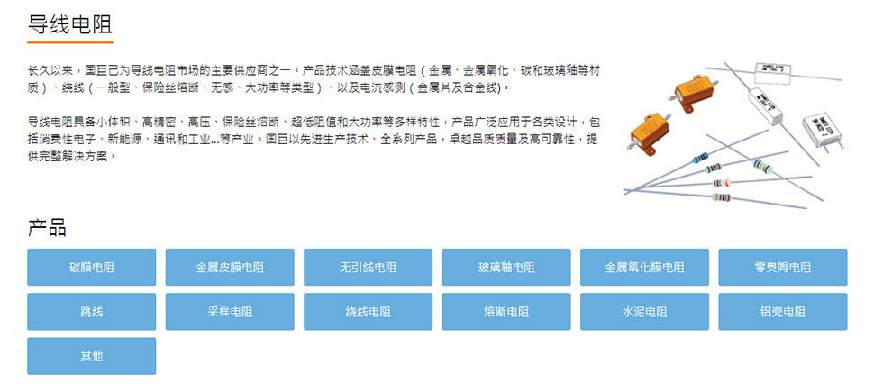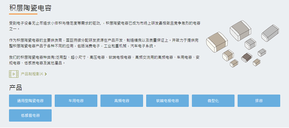 作為提供「一次購(gòu)足服務(wù)」的大型被動(dòng)組件供貨商,國(guó)巨提供完整的產(chǎn)品線,包括芯片電阻、積層陶瓷電容、導(dǎo)線電阻、無(wú)線組件、鋁質(zhì)電解電容和電感。國(guó)巨的多元化產(chǎn)品皆針對(duì)主要的垂直市場(chǎng)研發(fā),包括手機(jī)、平板計(jì)算機(jī)、網(wǎng)絡(luò)、家電、工業(yè)/電力、再生能源、醫(yī)療和汽車應(yīng)用。