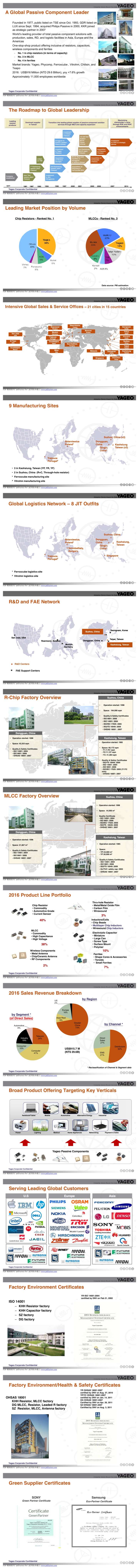 國巨現(xiàn)今為全球第一大芯片電阻器 (R-chip) 制造商、全球第三大積層陶瓷電容 (MLCC) 供貨商,在磁性材料 (ferrits) 領(lǐng)域則名列全球第三。國巨目前在全球18個國家有27個行銷/服務(wù)據(jù)點、8座生產(chǎn)基地、5座 JIT即時發(fā)貨中心,及3個研發(fā)中心。位于歐洲的飛磁(Ferroxcube) 和 Vitrohm 也隸屬于國巨集團,分別以生產(chǎn)磁性材料和傳統(tǒng)電阻為主。